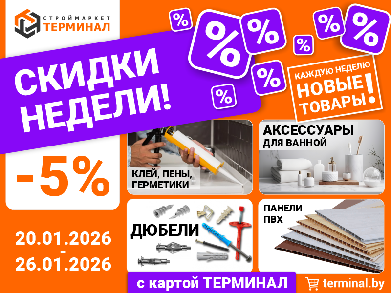 Акция действует с 20.01.2026 по 26.01.2026 года в интернет-магазине terminal.by, в строймаркетах "ТЕРМИНАЛ": г. Полоцк, ул. Зыгина, 40, г. Новополоцк, пер. Рижский, 8, г. Новополоцк, ул.Комсомольская, 2