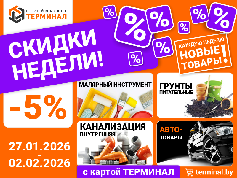 Акция действует с 27.01.2026 по 02.02.2026 года в интернет-магазине terminal.by, в строймаркетах "ТЕРМИНАЛ": г. Полоцк, ул. Зыгина, 40, г. Новополоцк, пер. Рижский, 8, г. Новополоцк, ул.Комсомольская, 2
