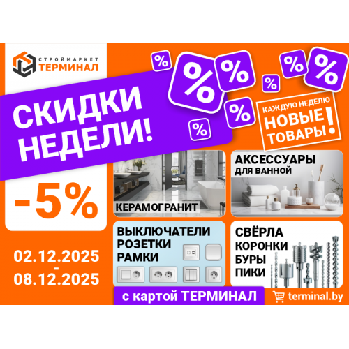 Акция действует с 02.12.2025 по 08.12.2025 года в интернет-магазине terminal.by, в строймаркетах "ТЕРМИНАЛ": г. Полоцк, ул. Зыгина, 40, г. Новополоцк, пер. Рижский, 8, г. Новополоцк, ул.Комсомольская, 2
